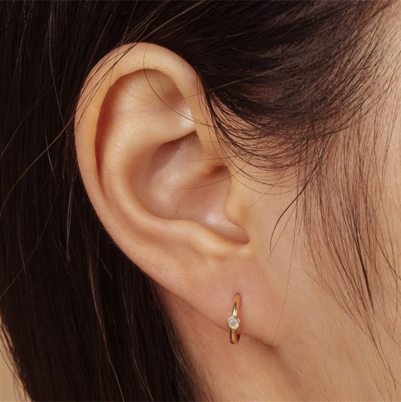 Our classic gold huggie hoops are modernized with round opals in this popular design. Wear the colors of the rainbow with these magical earrings.