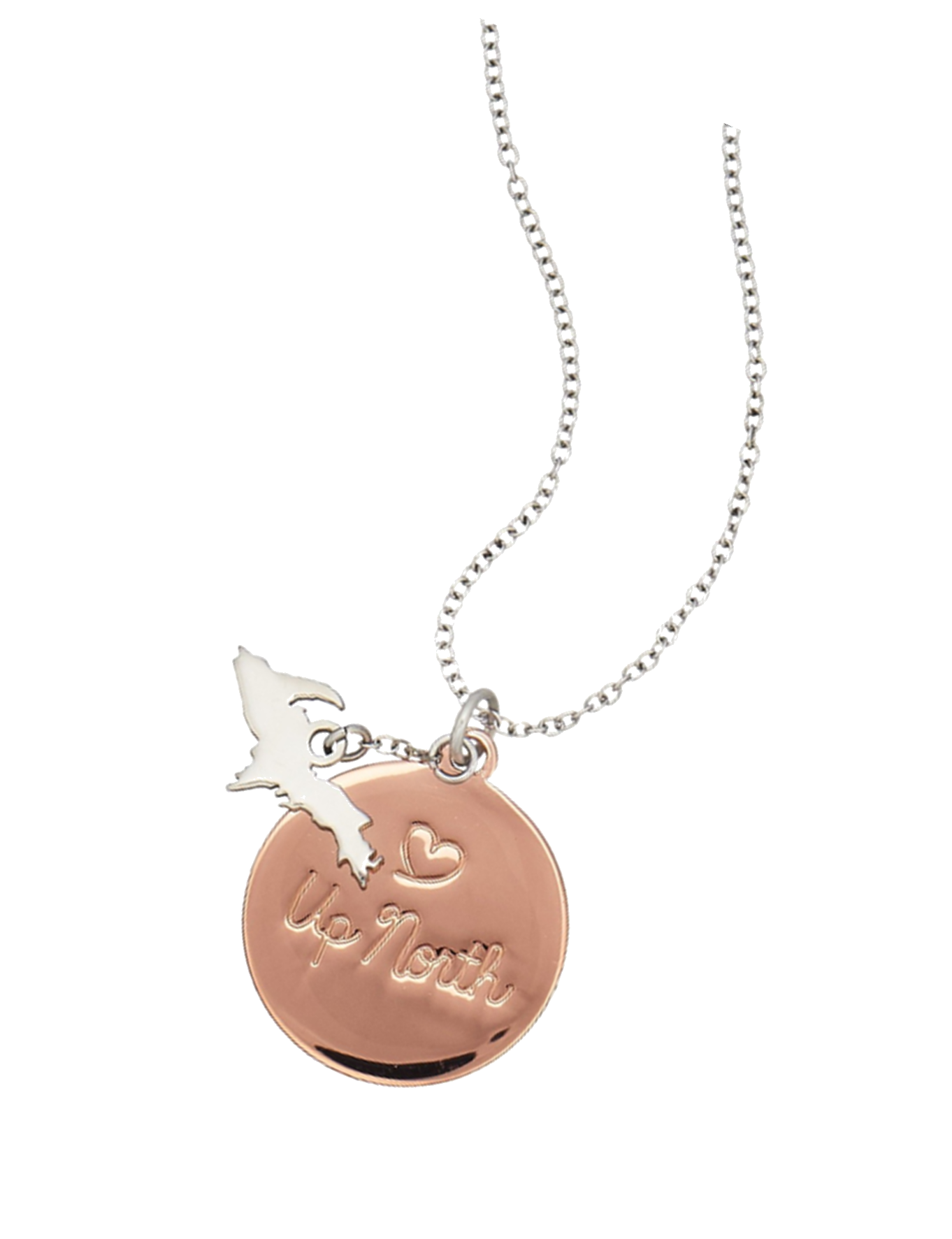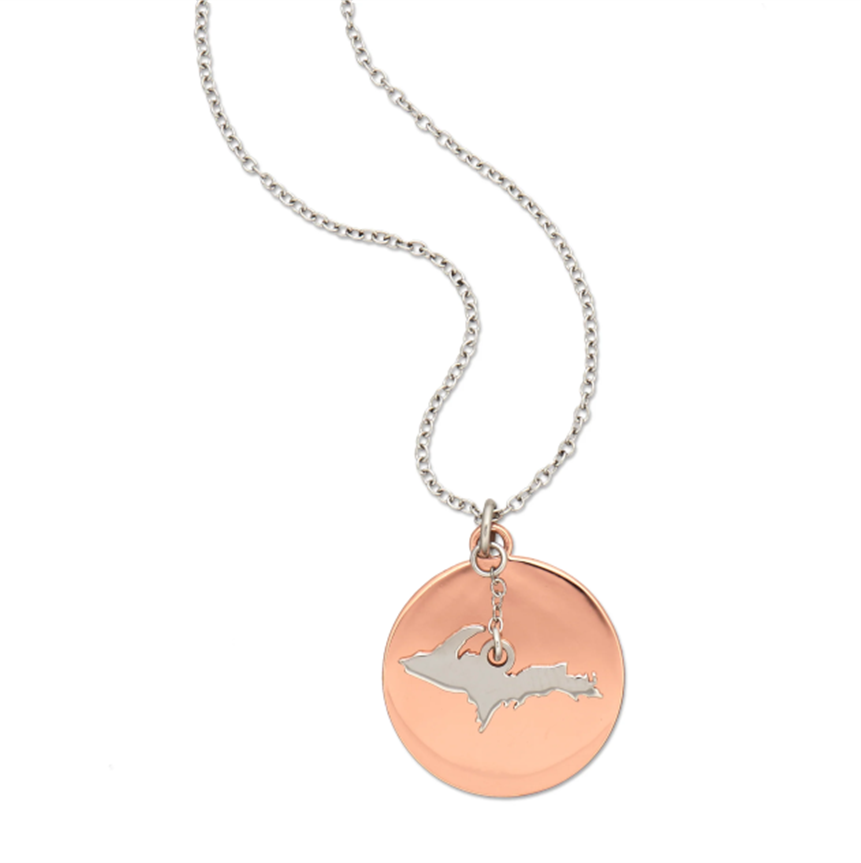 Show your love for Michigan with this ‘Love Up North’ Necklace. The UP charm hangs from an 18-inch stainless steel chain. The necklace is carefully crafted to detail Michigan’s Upper Peninsula which lays on top of a copper disk inscribed with ‘❤️ Up North’. Perfect gift for those born and raised as native Yoopers or for those who simply just love sweet sweet Michigan Upper Peninsula.