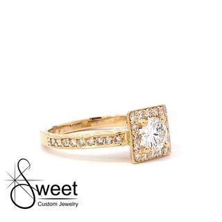 14KT YELLOW GOLD HAND CARVED, CUSTOM MADE ENGAGEMENT RING FEATURING ONE ROUND BIRLLIANT CUT BEZEL SET DIAMOND, .61CT, G IN COLOR SI2 IN CLARITY. THE CENTER DIAMOND IS ACCENTED BY A SQUARE HALO OF SMALLER ROUND BRILLIANT CUT PAVE SET DIAMONDS AND PAVE SET DIAMONDS DOWN THE SHOULDERS .34CTTW F-H IN COLOR VS-SI IN CLARITY.